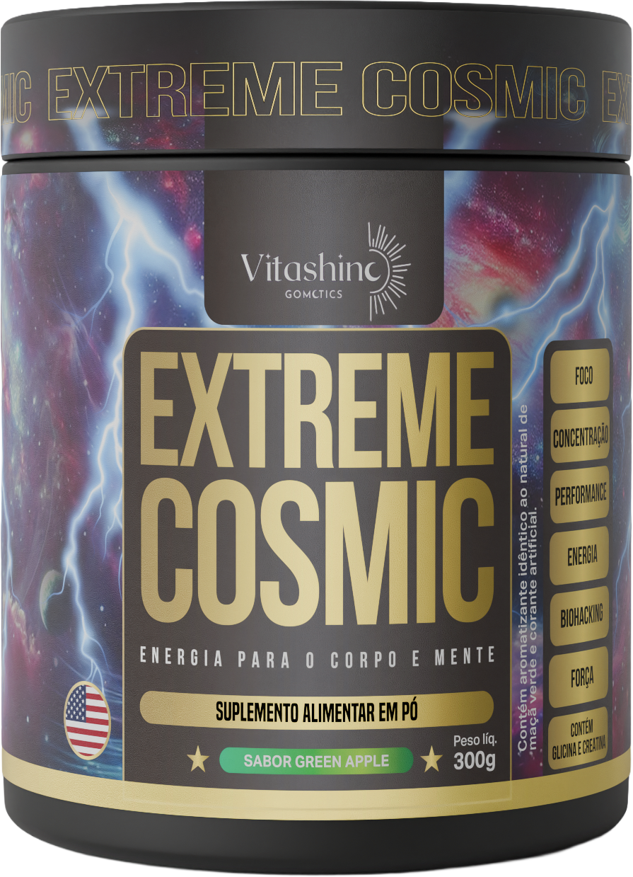 O Extreme Cosmic® dá o salto: une creatina + pré-treino em uma única dose diária. Com palatinose, beta-alanina, taurina, glicina, arginina e cafeína balanceada para energia linear, foco frio e consistência sem esforço.